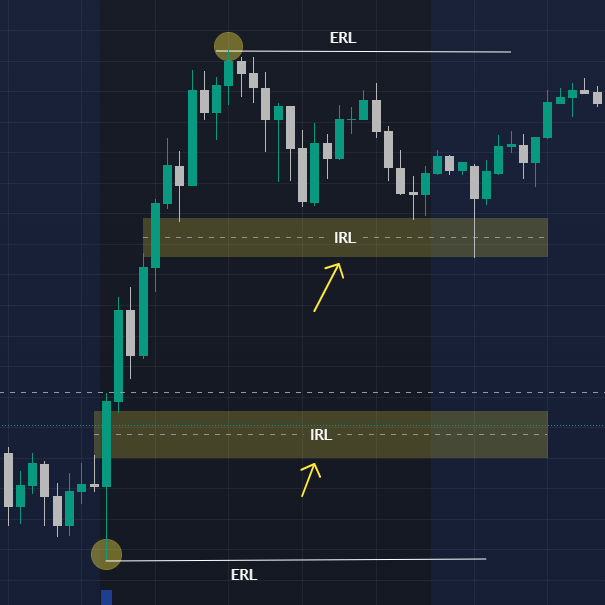 La Internal Range Liquidity (IRL) es la liquidez que se encuentra dentro del rango externo que explicamos anteriormente. A menudo es la más importante para la toma de decisiones intradiarias.