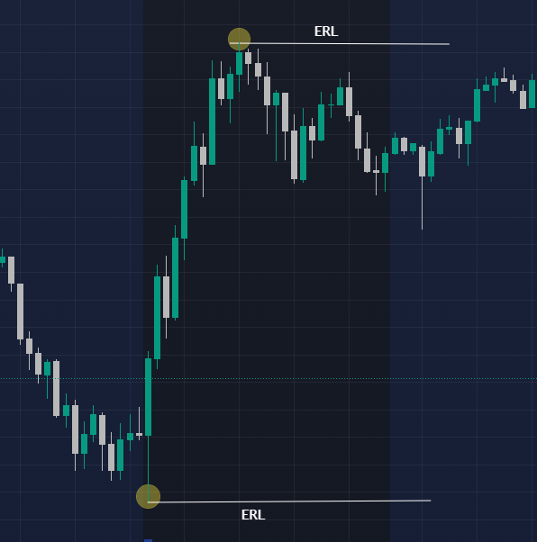 El External Range Liquidity (ERL) representa la liquidez que se encuentra fuera de un rango de negociación definido. Es la forma más obvia de liquidez que atrae el precio.
