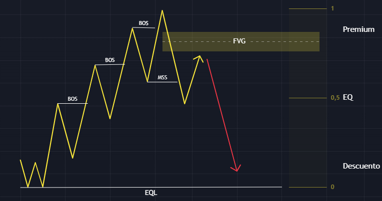 • Discount: La zona por debajo del 50%. Ideal para comprar (Longs). Un sesgo alcista buscará entrar en esta zona.